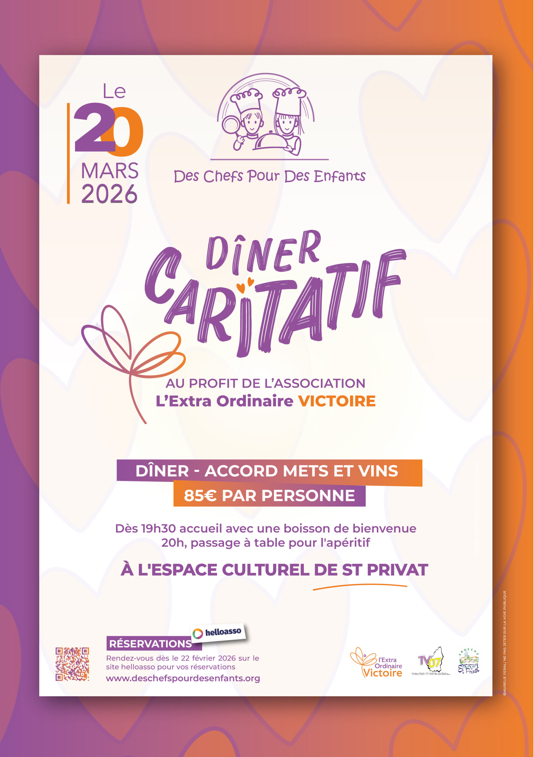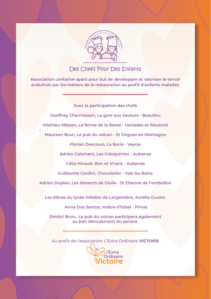 Cette année encore nos 7 chefs ardéchois et notre crémière mettrons en joie vos papilles avec ce 7ème repas, en faveur de l’association L’extra Ordinaire Victoire.